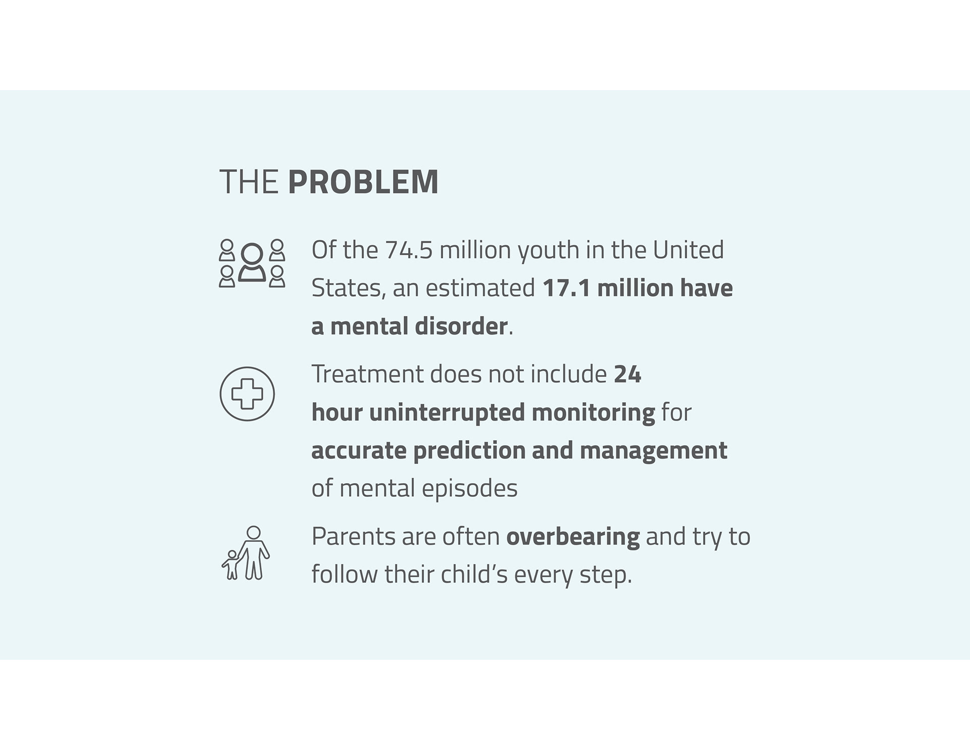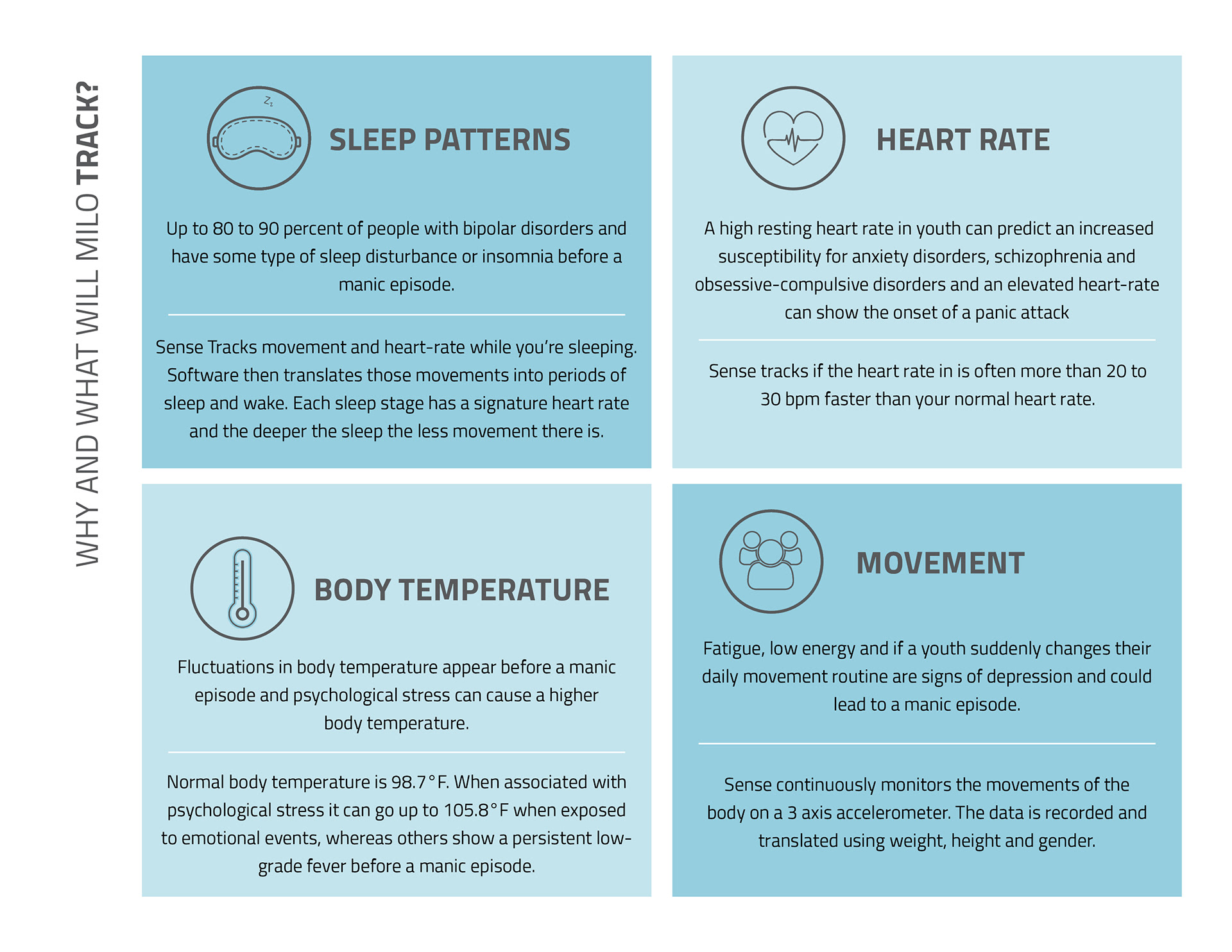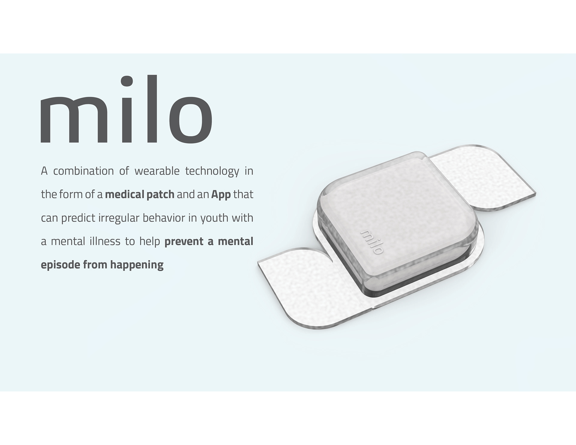 With more than 17.1 million youths in the USA with a mental illness, there is still no product on the market that can help predict and prevent a mental episode from happening. Milo, meaning calm, uses a combination of wearable technology in the form of a medical device and an App to monitor the body 24 hours a day. The combination of technology can predict irregular occurrences in sleep patterns, heart rate, temperature and regular activities in the youth with a mental illness and help prevent a mental episode from happening.